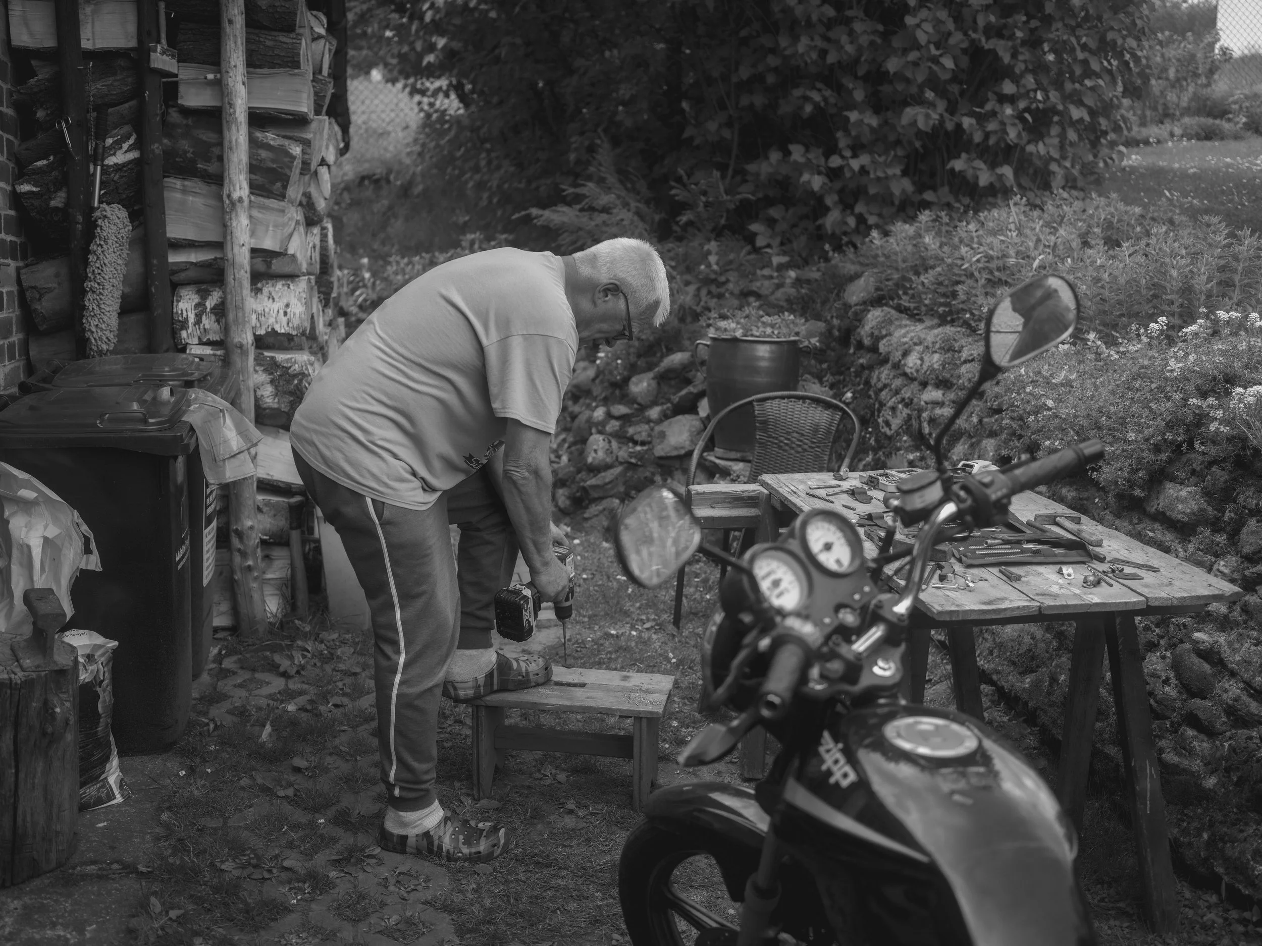 Tadeusz is well-known in the area for always being able to solve any problem. He helps everyone selflessly, without exception. Today, Tadek visited him. They are fixing his motorcycle. I grabbed my camera and spontaneously took some photos.