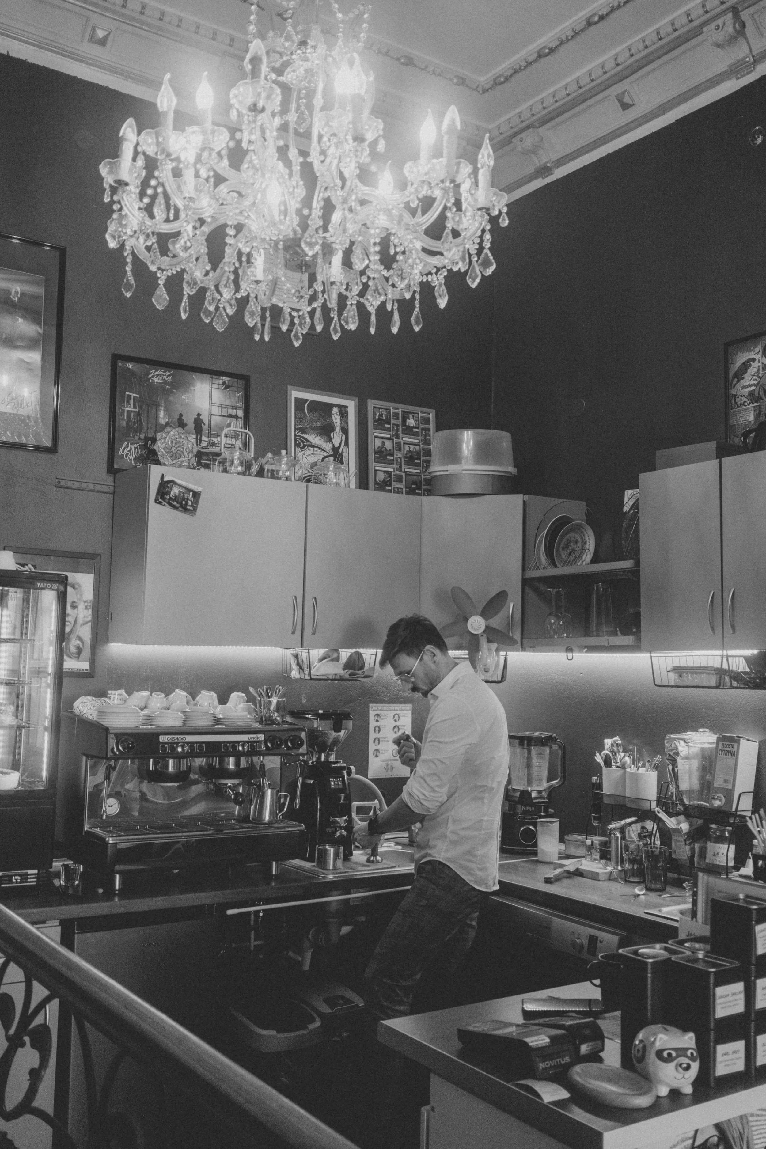 Przyciemnione, chłodne wnętrze kawiarni kontrastuje z wylewającym się potem na zewnątrz. Na ścianach plakaty filmowe jak trofea. Zajebisty wielki żyrandol zwisa majestatycznie - chyba nie pierdolnie? - nie wiem dlaczego kojarzy mi się z katastroficznym starym filmem. Pewnie kojarzę taką scenę. Nieważne. W powietrzu unosi się zapach świeżo zmielonej arabiki i starego celuloidu - kurwa Borucki! - bez przesady z tą wyobraźnią! Słychać cichy, utwór, sączący się ze starych głośników.