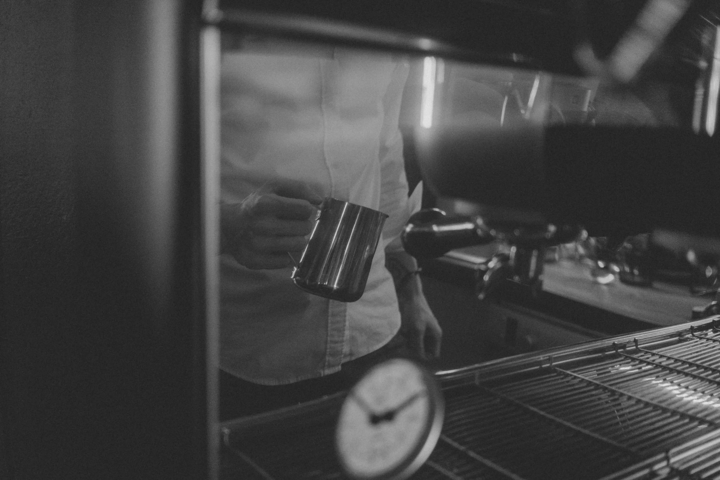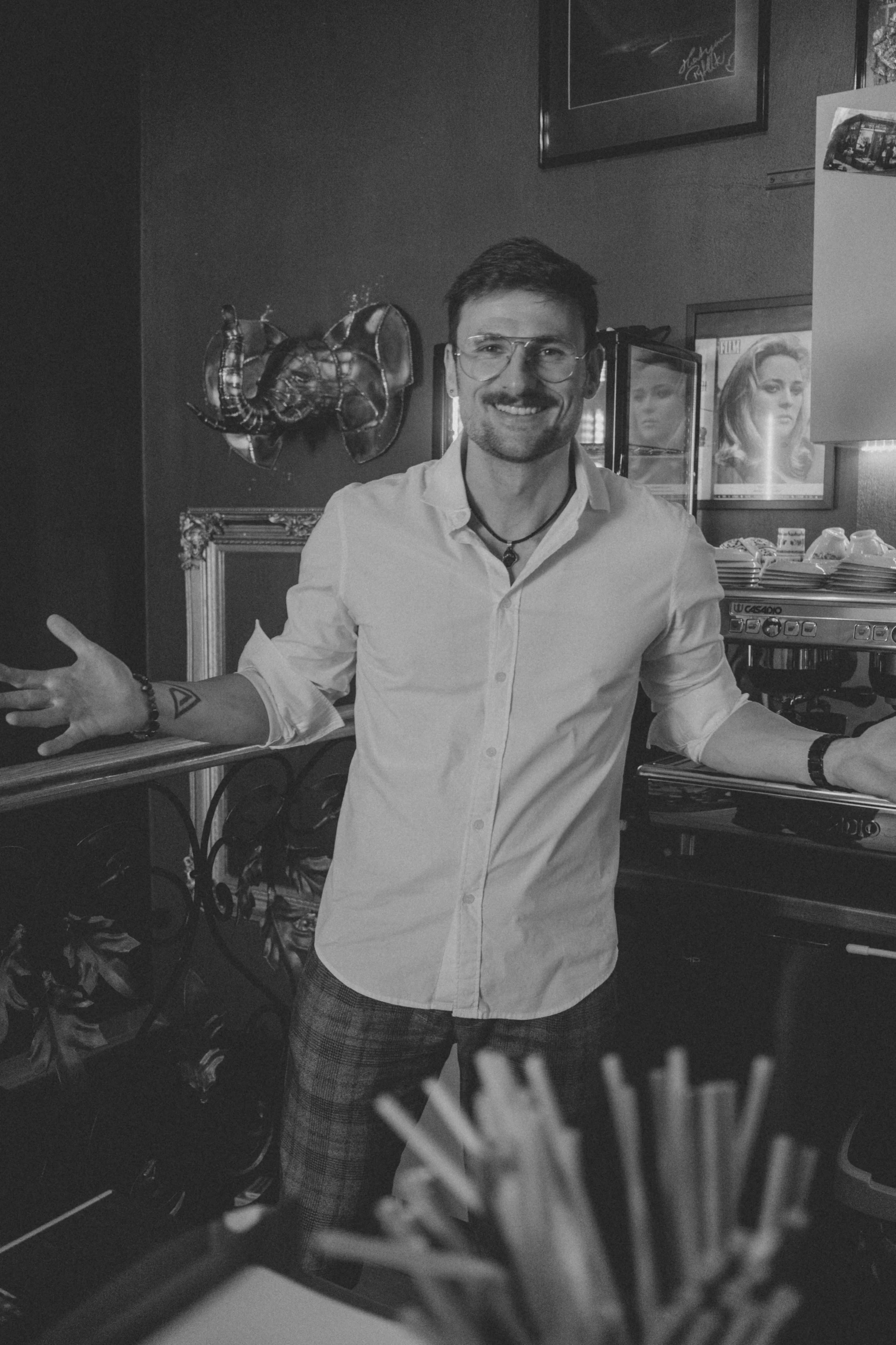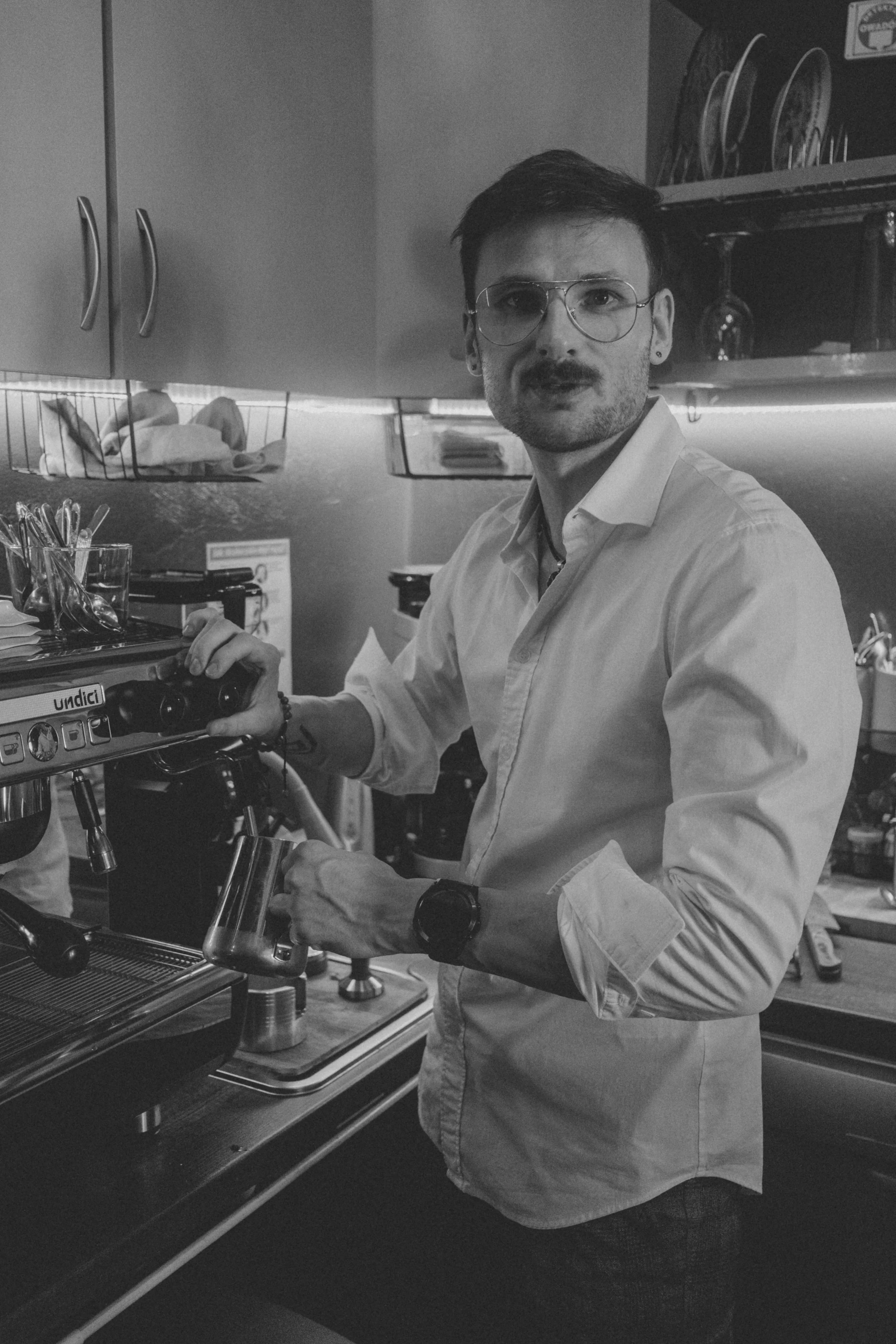 Kilka minut poźniej. Przy barze. Para unosi się filmowo. W tle widać, jak Marek operuje ekspresem. Cappuccino. Rozmawiamy o ...